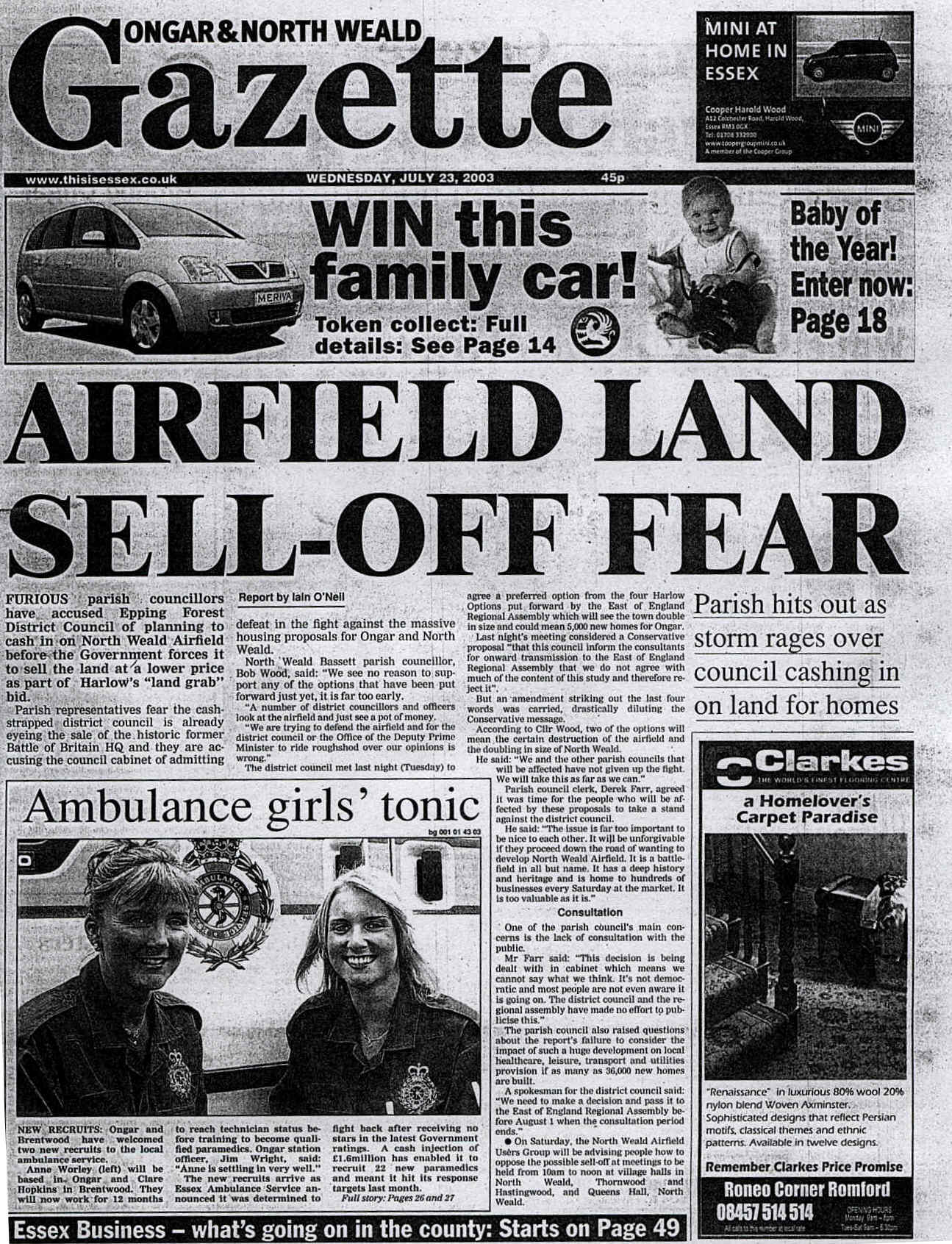 Members of North Weald Parish Council and North Weald Airfield Users Group were interviewed by reporters and highlighted the threat to this historic and versatile site. View the short ITN video clip here (650 kb)24.07.03 "Fight is on to Save North Weald Airfield" reported in the Ongar and North Weald Gazette and the Epping GuardianThe issues